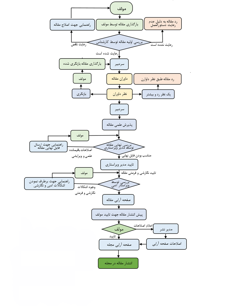 8- انتشار مقاله. (تمامی مقالات، پس از صفحه آرایی و ویراستاری و قبل از انتشار برای نویسنده مسئول ارسال می شوند، تا در صورتی که مواردی نیاز به کنترل و تغییر داشته باشند، انجام شود و در نهایت، تاییدیه نویسنده برای انتشار اخذ می شود . )